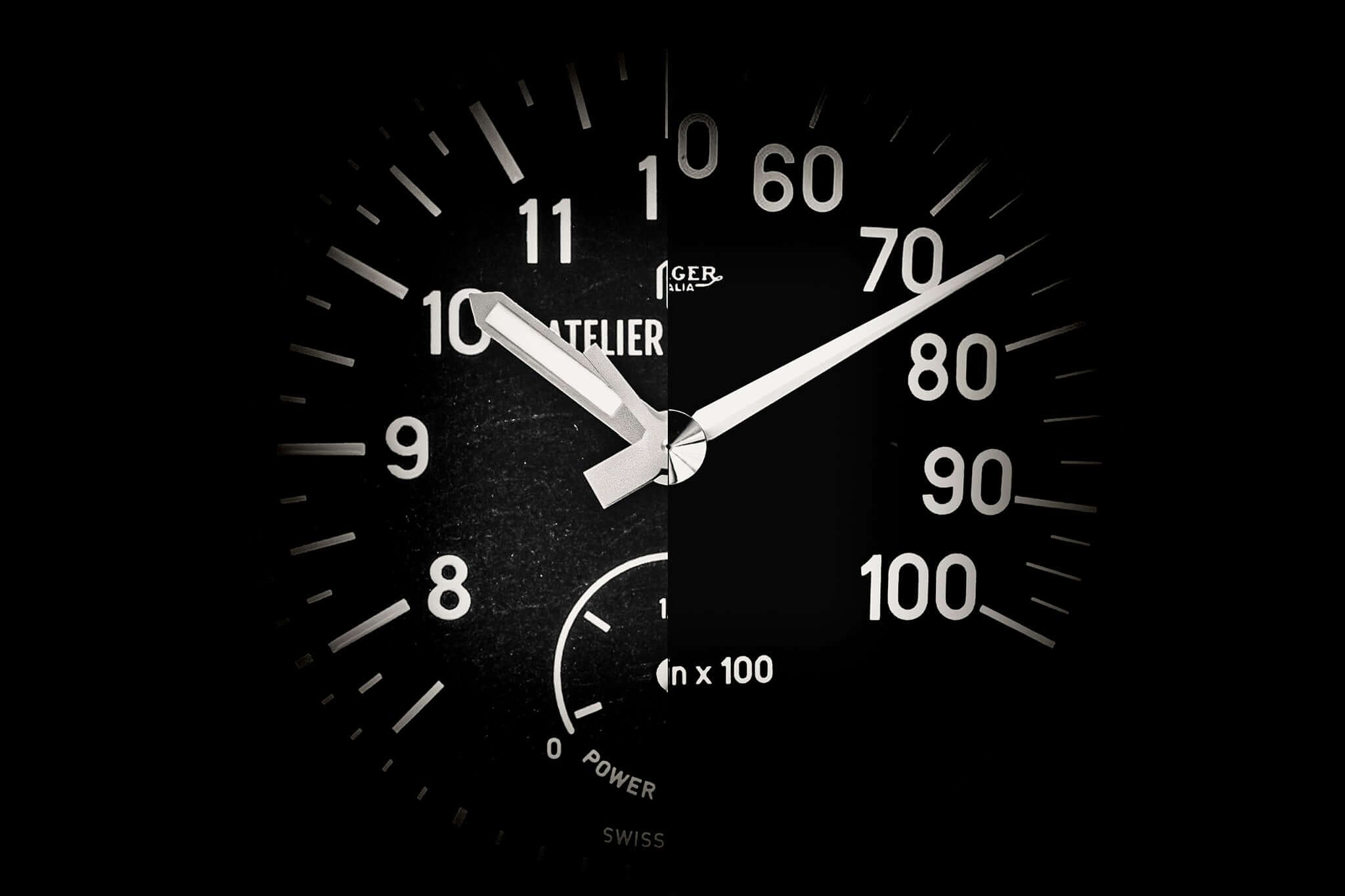 This 1969 Miura P400 S was hit by flames several years ago, a fate unfortunately common to this model due to the arrangement of the carburetors above the spark plugs and ignition. The AJ-P400's anodized black dial and smoked case-back glass bear witness to the car's fiery past, paying subtle homage to it.