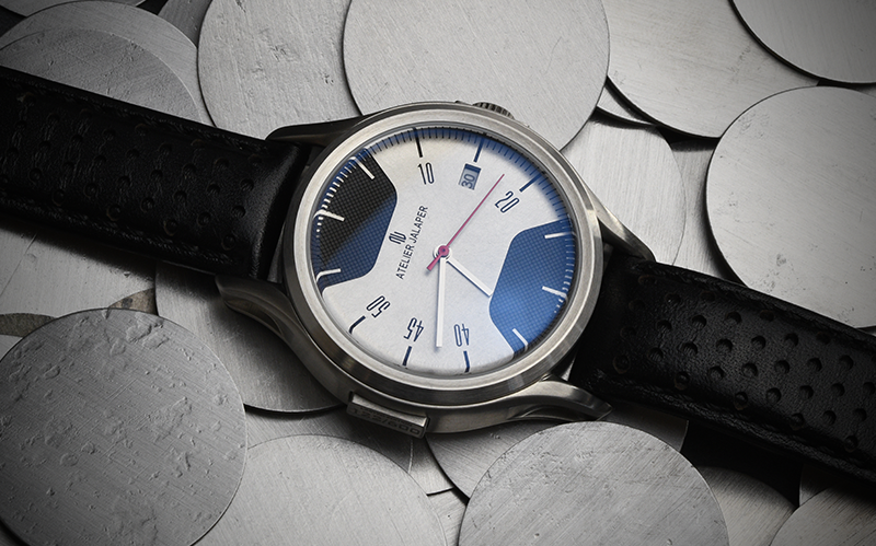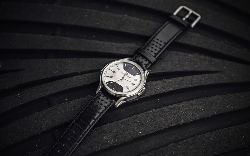 Chacune des montres de la collection possède un cadran directement découpé dans le capot d'une Aston Martin DB5 , qui a été authentifié par Aston Martin Works à Londres. Pour transformer cette pièce brute d’une des voitures britanniques les plus mythiques en un véritable cadran d’horlogerie, il a d’abord fallu découper l'aluminium, l'aplatir et le traiter afin de pouvoir y emboutir nos cadrans. Ils ont ensuite été gravés au laser pour laisser apparaitre les index rappelant le compteur de la voiture, tout en conservant la patine qui rend chaque montre unique. Enfin, l'intégration du mouvement automatique et l'assemblage dans son boîtier en acier se sont entièrement déroulés dans notre atelier suisse de La Chaux-de-Fonds.