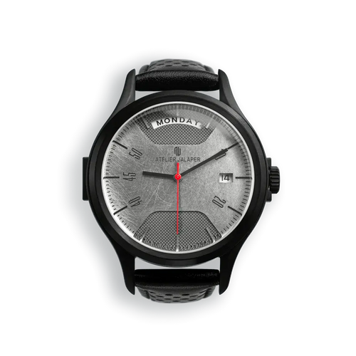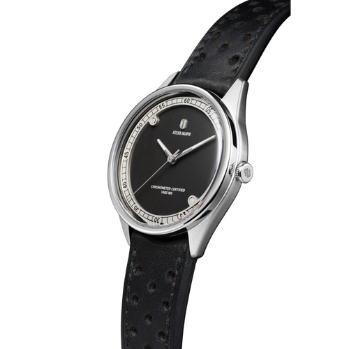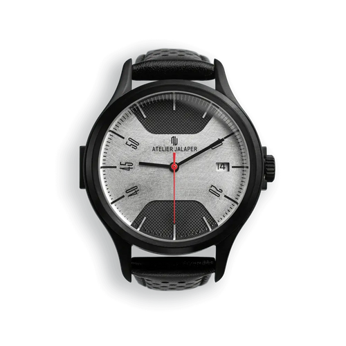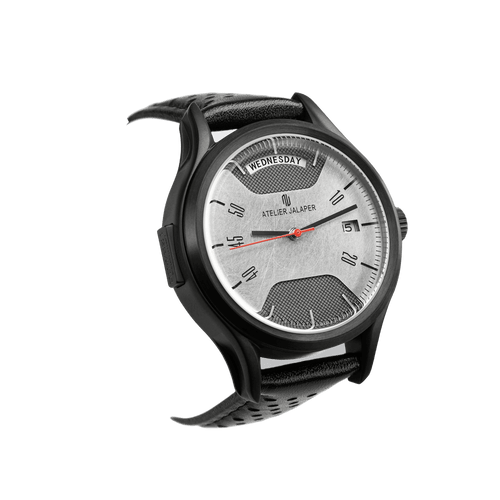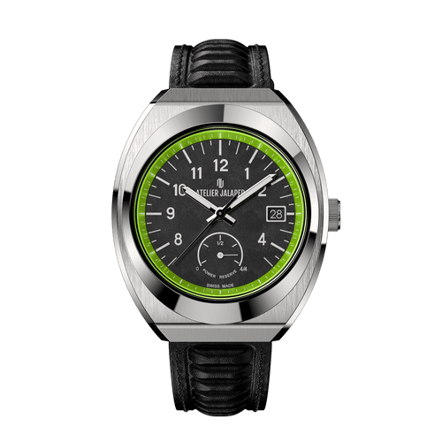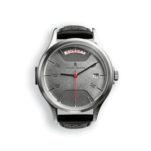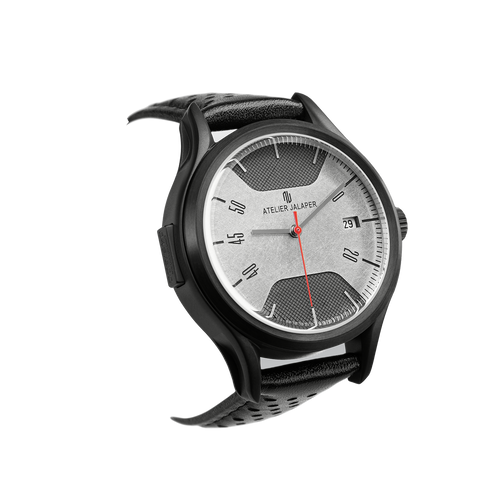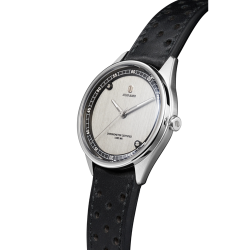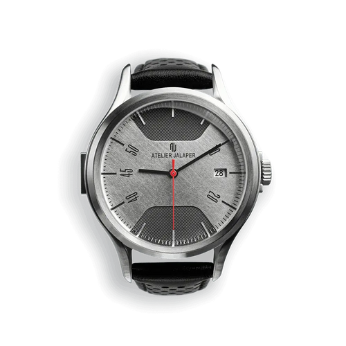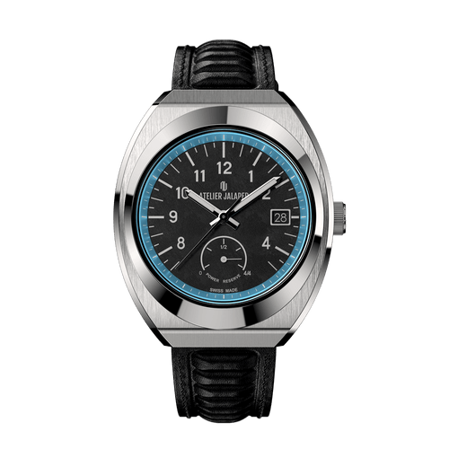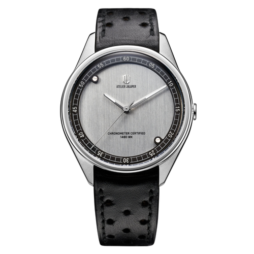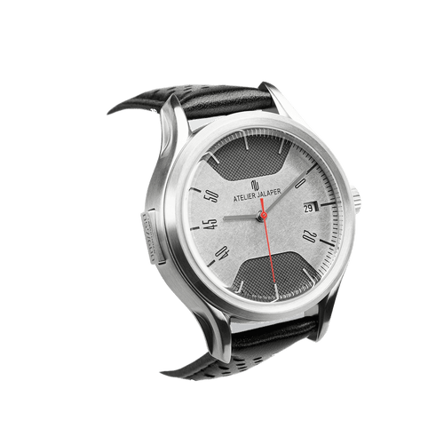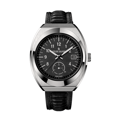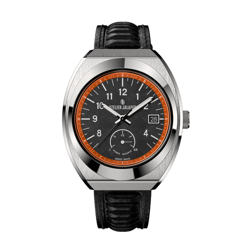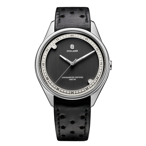 A beautiful grey bull leather strap and its black stitches which match the minute ring of the AJ-P400-N.